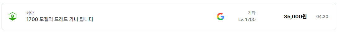 반면 배럭 위주의 1700 전후 계정은 가격이 비교적 낮다. 카단 서버의 1700 모챌익 계정이 3만 5천 원에 거래된 사례나, 1665 브레이커 계정이 2만 5천 원에 등록된 것을 보면 진입용, 이벤트 소모용 수요가 중심임을 알 수 있다. 이런 계정은 빠른 처분을 원하는 판매자가 많아 가격 경쟁이 심한 편이다.