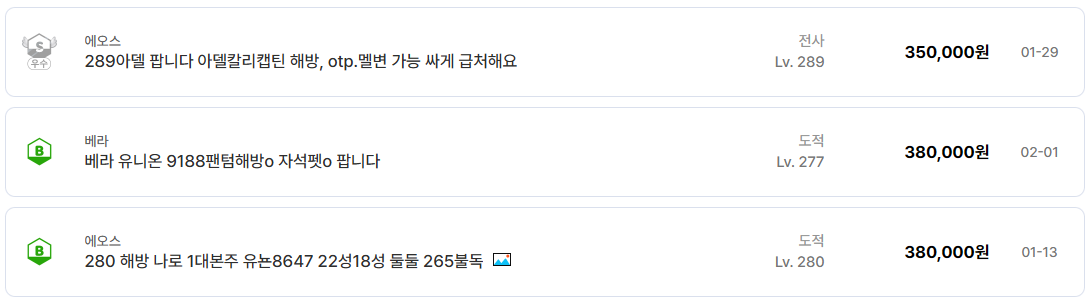 반대로 레벨이 높더라도 명의 이전 불가, OTP·멜변 제한 등 조건이 까다로운 계정은 가격이 상대적으로 낮게 형성된다. 이는 구매 이후의 안정성과 장기 사용 가능성을 중시하는 유저 인식이 그대로 반영된 결과다.