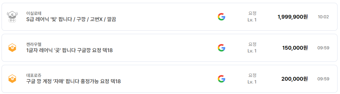 또 하나의 특징은 이른바 ‘구깡 계정’에 대한 선호다. 구글 연동이 깔끔하게 정리된 1대 계정은 향후 거래나 운영 안정성 측면에서 선호도가 높다. 실제로 ‘구깡’, ‘1대’, ‘고번 없음’ 등의 키워드가 포함된 계정들이 상대적으로 빠르게 거래되고 있으며, 같은 닉네임이라도 해당 조건이 붙으면 가격이 더 높게 책정되는 경향을 보인다.