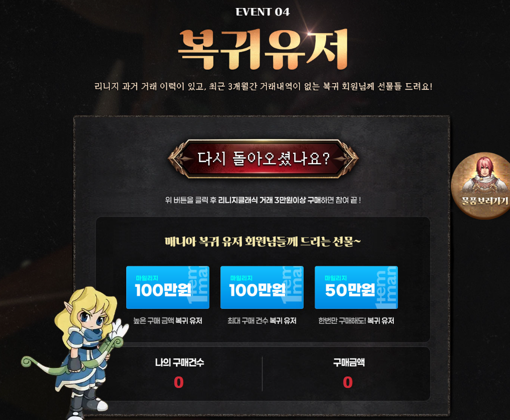 오랜만에 리니지 클래식으로 돌아오는 유저를 위한 복귀 이벤트도 함께 진행됩니다.