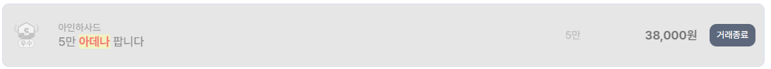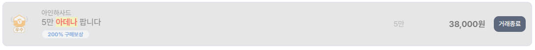 아인하사드 서버는 최저가 구간이 인상적이다. 4만 아데나를 30,000원, 5만을 38,000원에 거래한 사례가 반복적으로 확인된다. 이는 1만 아데나 기준 7,000원대 중반 수준으로, 서버 내 아데나 공급량이 상당히 많다는 것을 의미한다. 단기적으로 현금화하려는 유저들이 많을수록 이런 가격대가 형성된다.