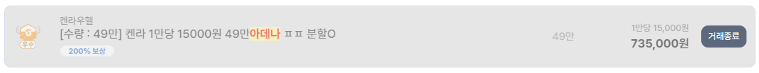 켄라우헬 서버는 가격 안정성이 가장 눈에 띈다. 2만 아데나 22,000원, 3만 31,000원, 4만 50,000원, 6만 68,400원 등 전반적으로 1만 아데나당 11,000원~13,000원대에서 거래가 종료됐다. 특히 49만 아데나를 1만당 15,000원으로 일괄 판매한 사례는 대량 물량도 소화 가능한 서버라는 점을 보여준다. 사냥 기반 유저가 많고 공급이 꾸준한 서버의 전형적인 흐름이다.