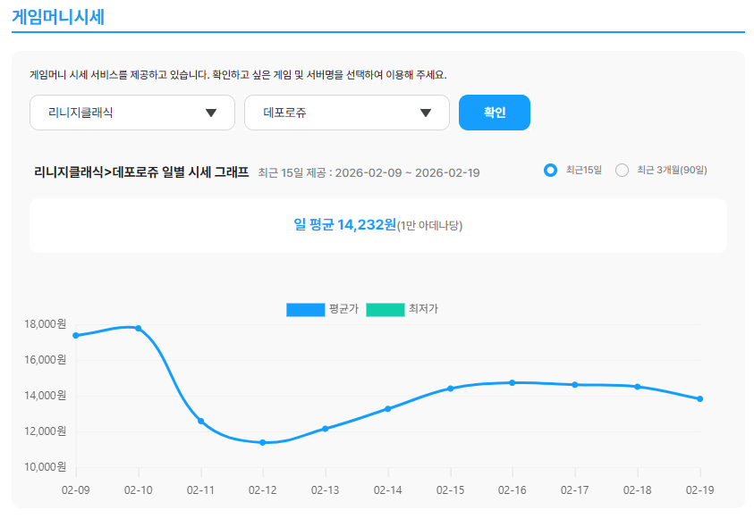 최근 리니지 클래식 데포로쥬 서버의 아데나 가격이 큰 변동성을 보이고 있다. 제공된 최근 15일 일별 평균 데이터를 기준으로 보면 단순한 등락이 아니라 급락 이후 점진적 회복 흐름이 나타나고 있다. 실제 거래된 평균 가격 데이터를 기반으로 현재 위치와 향후 방향성을 분석해보자.