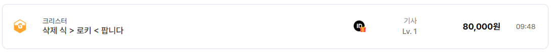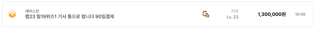 중간 레벨 및 정액제 포함 계정: 세바스챤 서버의 23레벨 기사는 90일 정액 이용권과 함께 1,300,000원에 거래 목록에 이름을 올렸습니다. 캐릭터의 성향(힘19, 위즈1)이 명확하고 결제 기간이 넉넉할수록 구매자들의 선호도가 올라갑니다.