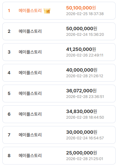 상위 8개 중 7개가 메이플스토리다. 모두 실제 거래 완료 금액 기준이다. 단일 게임에서 5천만 원대 거래가 반복 체결됐다는 것은 단순 고가 1건이 아니라, 고자산 유저층이 꾸준히 움직이고 있다는 의미다.
