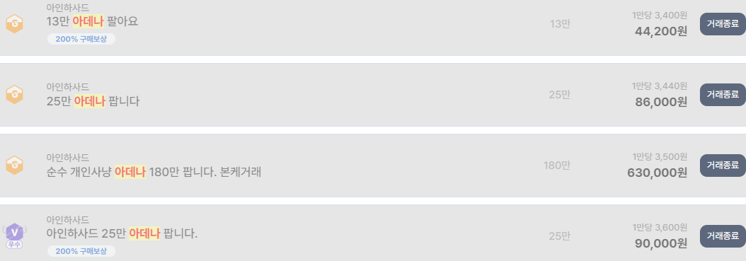 아인하사드 서버에서는 다음과 같은 가격에 거래가 완료되었습니다.