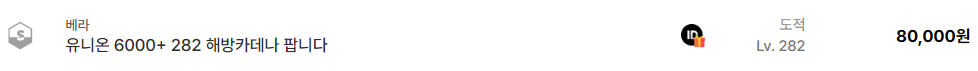 한편 베라 서버에서는 282레벨 카데나 계정이 약 8만원에 올라와 있다. 유니온 6000 이상 조건이 포함되어 있지만 장비 구성이나 추가 요소가 많지 않기 때문에 비교적 낮은 가격으로 올라온 사례다.
