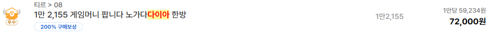 또 다른 거래를 보면 티르 서버에서는 1만2155 다이아가 약 7만2000원에 올라온 사례가 있다. 이 경우 1만 다이아 기준 가격이 약 59234원으로 비교적 높은 단가를 형성하고 있는 모습이다. 이러한 차이는 판매 방식이나 다이아 출처, 판매자의 조건 등에 따라 발생하는 경우가 많다.