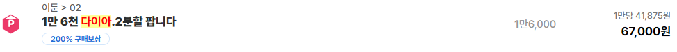 먼저 소량 거래 구간부터 살펴보면 1만 다이아 전후 판매 글이 꾸준히 올라오고 있다. 예를 들어 이둔 서버에서는 1만6000 다이아가 약 6만7000원에 등록되어 있다. 단가 기준으로 보면 1만 다이아당 약 41875원 수준이다.