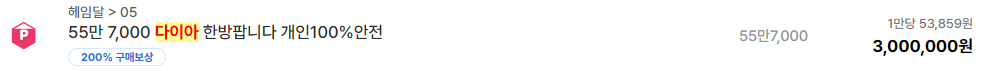 가장 큰 거래 단위로는 50만 다이아 이상 판매 글도 확인된다. 헤임달 서버에서는 55만7000 다이아가 약 300만원에 등록되어 있다. 단가 기준으로 보면 1만 다이아당 약 53859원 정도다. 이 정도 규모의 거래는 한 번에 많은 다이아를 확보하려는 유저들이 선택하는 방식이다.