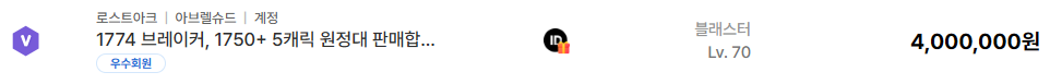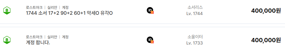 그에 비해 1744 소서리스 계정은 400,000원에 거래되었습니다. 레벨은 높지만 배럭의 구성이나 보석 스펙이 상대적으로 낮아 입문용 고레벨 계정으로 분류된 사례입니다. 1733 소울이터 계정 역시 동일한 400,000원대에 거래되며 1700레벨 초반대의 단일 캐릭터 위주 계정은 현재 30만 원에서 50만 원 사이의 시세를 형성하고 있음을 보여줍니다.