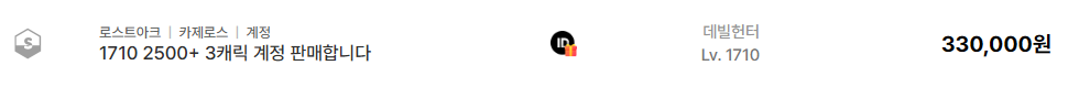 카제로스 서버의 1710 데빌헌터 계정은 330,000원에 거래되며 1700레벨 진입 장벽을 넘은 계정 중 가장 접근성이 좋은 시세를 보여주었습니다. 이는 직접 육성하는 비용 대비 매우 저렴한 수준으로 최근 많은 유저가 아이템매니아를 통해 육성 시간을 절약하려는 경향을 뚜렷하게 보여줍니다.