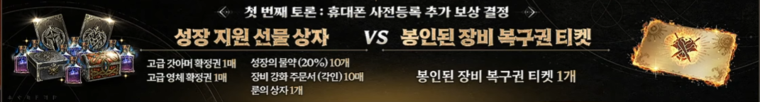 - 안건 2 (안정 지향형): 강화 실패로 파괴된 장비를 1회 살릴 수 있는 봉인된 장비 복구권입니다. 고강화 장비를 노리는 유저들에게 필수적인 아이템입니다.