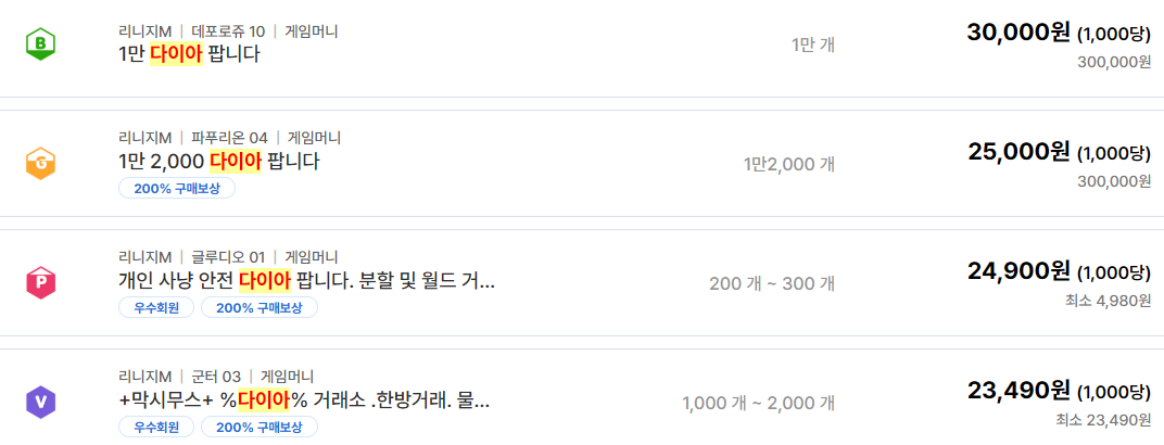 다이아 시세 형성과 서버별 차이