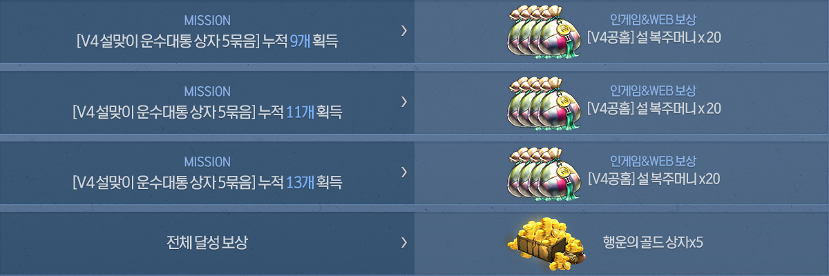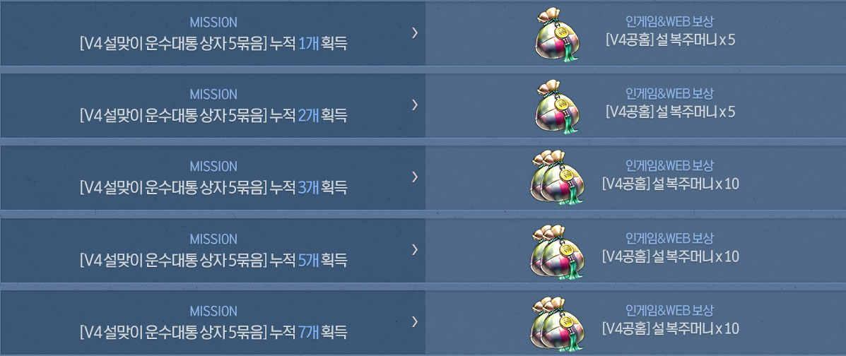5묶음을 1개 획득 하면 복주머니를 5개 지급하고