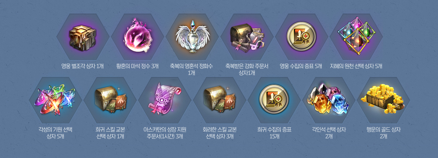 영웅 별조각 상자 부터 황혼의 마석 정수, 영웅 수집의 증표, 지혜의 원천 선택 상자 등