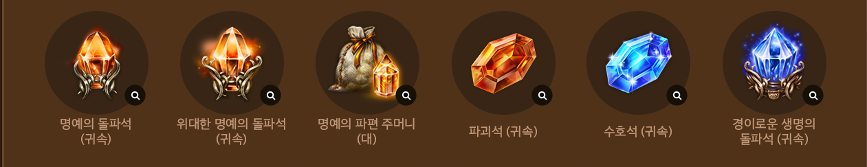 명예의 돌파석, 위대한 명예의 돌파석, 명예의 파편 주머니, 파괴석이 여기에 있죠.