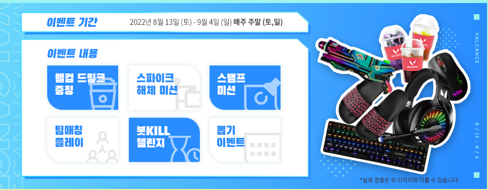 당첨 상품: PC방 1시간 이용권, 발로란트 슬리퍼, VAL캉스 라면, 마우스, 키보드, 헤드셋