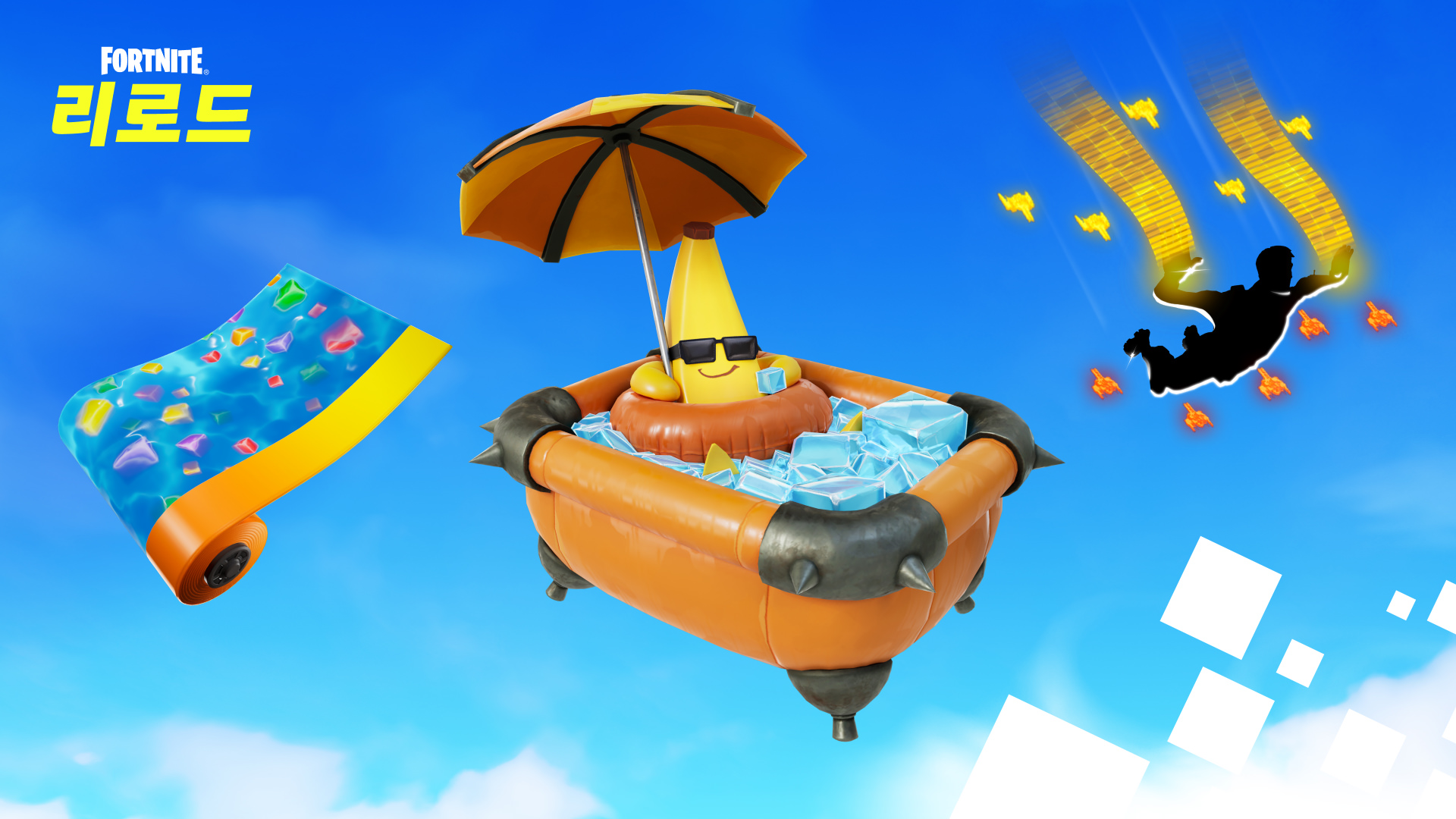포트나이트 리로드에는 각각 20,000 XP를 보상으로 주는 인트로 퀘스트가 있습니다. 인트로 퀘스트 3개 완료 시 디지털 공중전 스카이다이빙 트레일, 6개 완료 시 수영장 큐브 랩핑 시트지, 9개 완료 시 나나 목욕 등 장신구! 를 잠금 해제합니다. 빅토리 로얄을 달성하면 레즈브렐라 글라이더를 얻습니다.